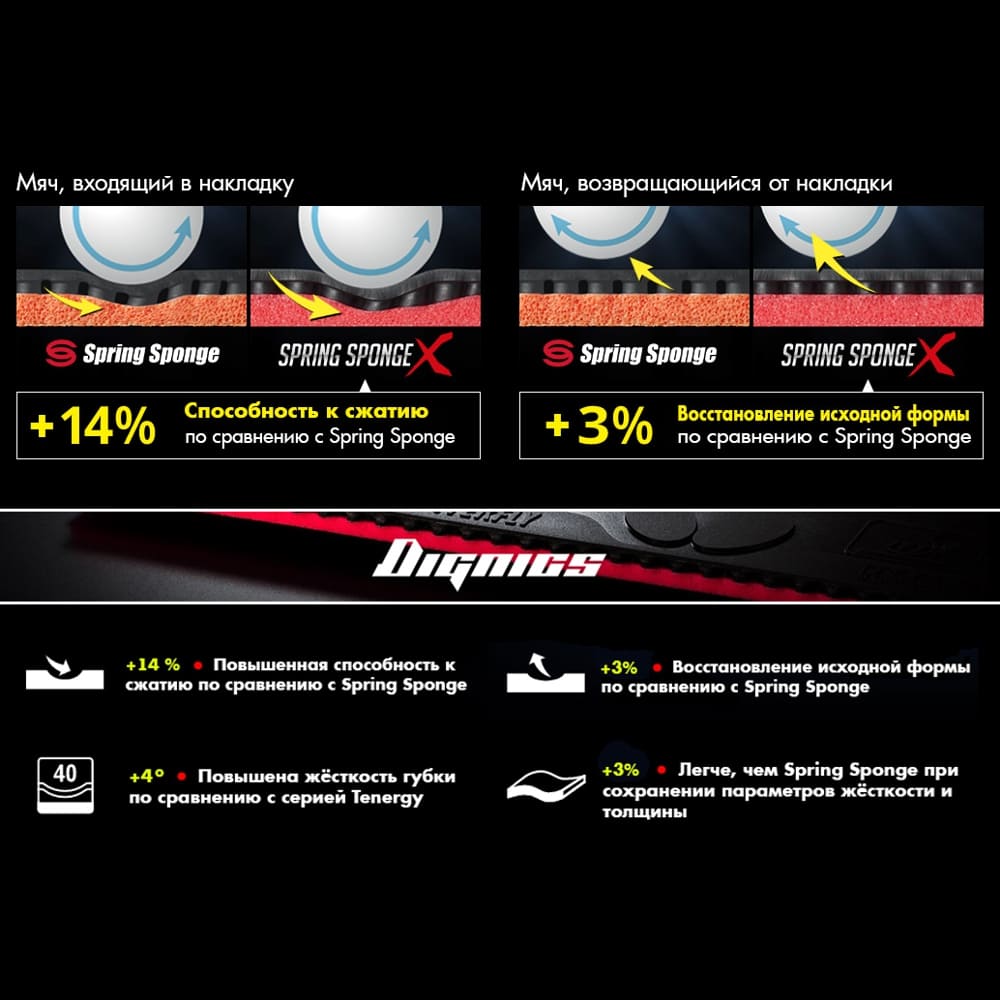 Накладка Butterfly Dignics 09C – новинка преміум класу в серії накладок Dignics, що суттєво відрізняється від інших накладок цієї лінійки.Підійде для гравців вищого рівня, які мають відповідну ударну техніку та тренувальні амбіції. Ця накладка має ряд особливостей, а саме: – дуже липка поверхня накладки, що забезпечує потужне обертання; – використання жорсткішої губки (44 градуси); – виготовлена за новою технологією Spring Sponge X, що дає ряд переваг у порівнянні зі Spring Sponge;- забезпечує можливість здійснювати атаку сильними топспінами з дуже високою траєкторією при відносно помірній швидкості. Варто розповісти про лінійку накладок Dignics, які з’явилися після світового бестселера Tenergy, хоча розробки цієї гілки почалися задовго до того, як Tenergy набула своєї слави Мотивація була дуже проста: «створення чогось, чого ніколи не було» та пошук «високоефективної гуми, яка призведе гравців до нових перемог». Дослідження проводилося на основі великої кількості ноу-хау-технологій, накопичених під час розробки Tenergy. Через дев’ять років поглибленої роботи Відділу досліджень та розробок компанії Butterfly увінчалася створенням нової губки Spring Sponge X, яка покликана генерувати ще більше потужності. Головний алгоритм Dignics – поєднання Spring Sponge X та нової гумової поверхні (топшиту). Більш крута дуга при виконанні топспину та стабільний потужний удар стали можливими завдяки поєднанню Spring Sponge X та нової гумової поверхні. М’яч добре тримається на накладці. Це особливо важливо та помітно під час обміну топспінами та при виконанні банана (скидки зліва зі столу).Чим більше ви б’єте по м’ячу, тим сильніше зношується поверхня накладки, особливо в тому місці, де м’яч контактує з нею найчастіше. На фото (в каруселі) видно, що після однакового використання поверхня звичайної накладки зношена, а поверхня Dignics набагато свіжіша, що показує високу стійкість до стирання ігрової поверхні. Тобто накладки цієї серії більш зносостійкі, ніж Tenergy.