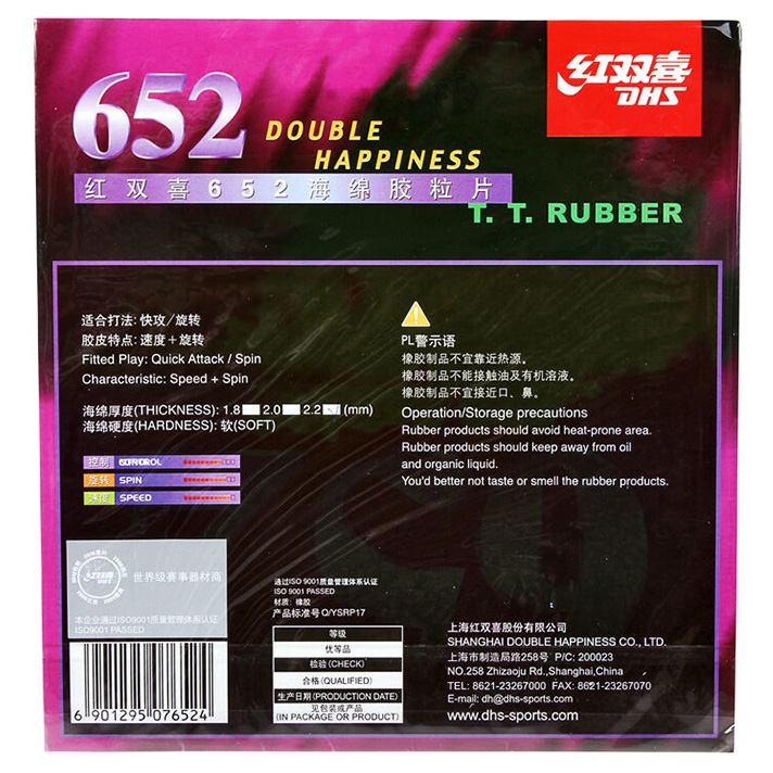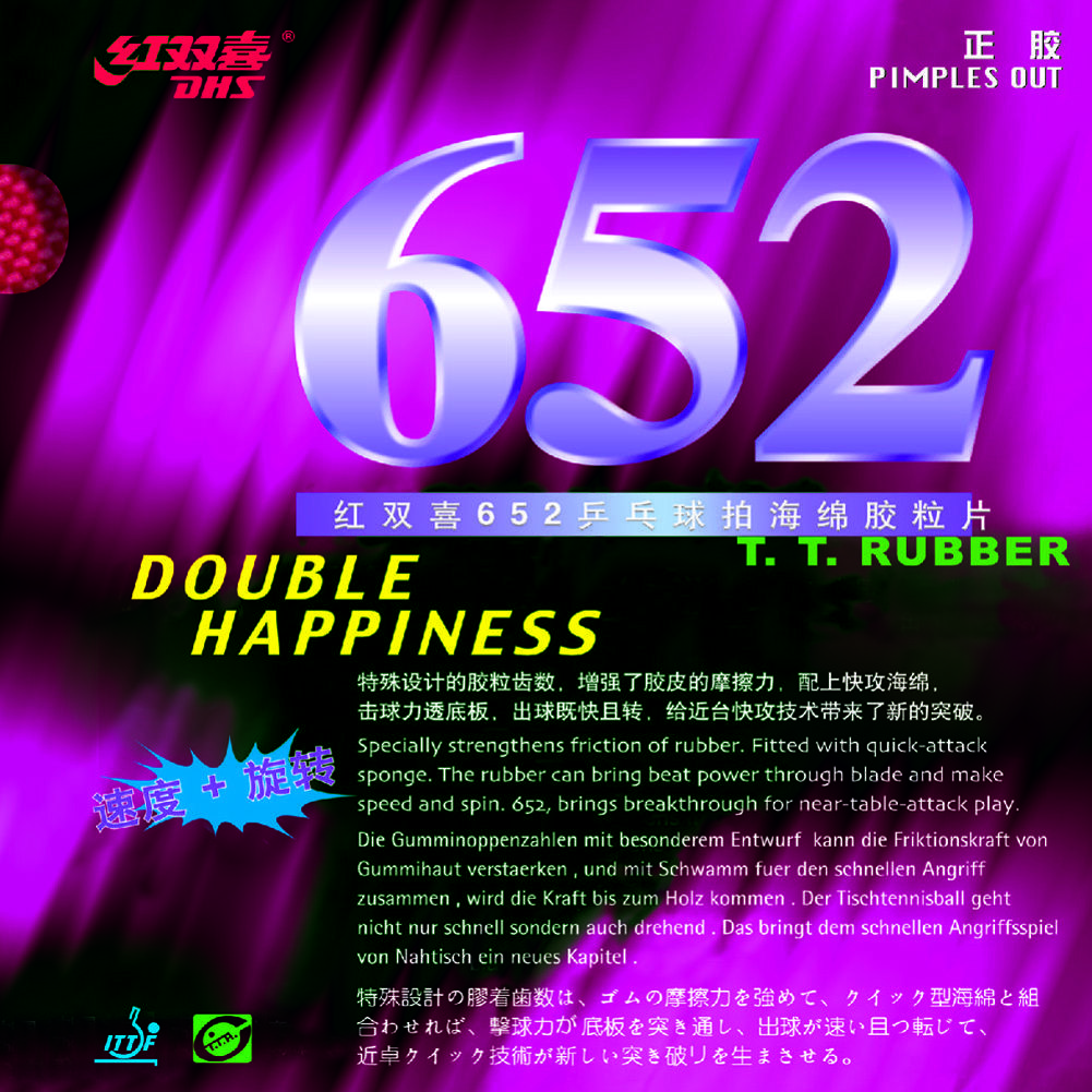 Накладка DHS 652 має короткі шипи з м’якою губкою, сподобається любителям атакуючого стилю гри. Характеризується високими показниками швидкості та контролю.