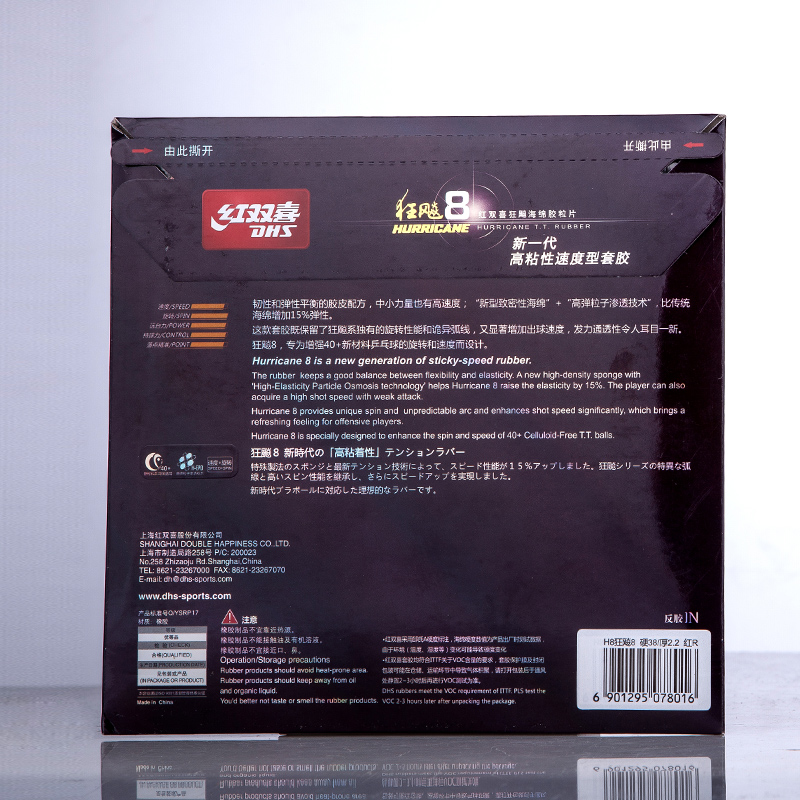Накладка Hurricane 8 – нове покоління швидкісних накладок з липкою поверхнею. Вона гнучка та еластична. Нова губка, з поміщеними в мікростільники частинками з високою еластичністю, має підвищену щільність і на 15% еластичніша. Поверхня накладки більш липка, порівняно з попередніми HURRICANE. Накладка Hurricane 8 надає м’ячу унікального обертання та непередбачуваної траєкторії польоту, значно збільшуючи його швидкість. Ідеальна для гравців атакуючого стилю, з можливістю поєднувати удари з високою швидкістю та слабку атаку. Вона спеціально розроблена для посилення обертання та збільшення швидкості при грі пластиковими м’ячами для настільного тенісу 40+.