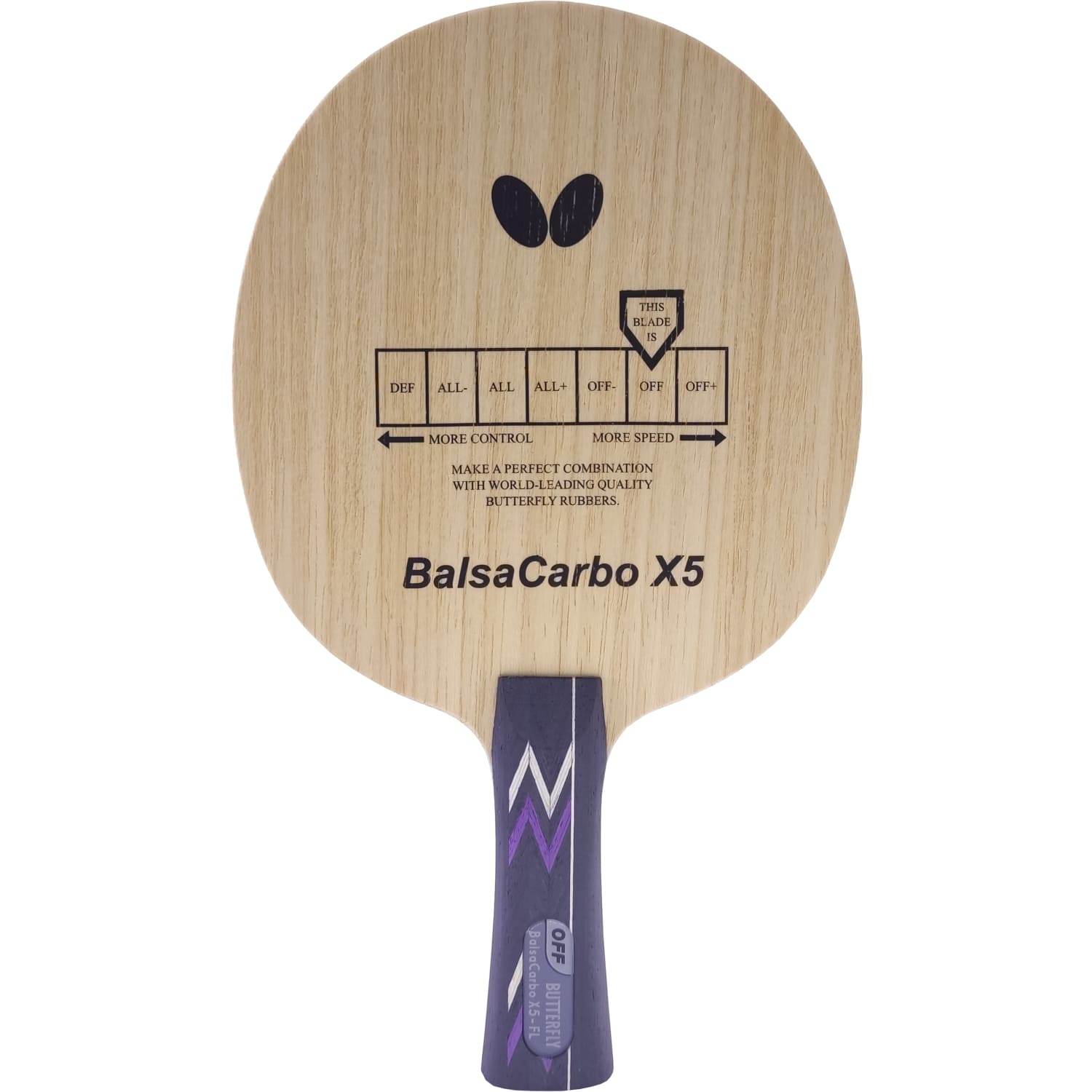 Основа для ракетки Butterfly Balsa Carbo X5 – перша основа в сімействі Butterfly, в якій використана бальза – дуже легкий та м’який сорт деревини, розташований у цетральній частині. У поєднанні з шарами карбону ця основа чудово підходить для комфортної та різноманітної гри на блоці, а також для силової атакуючої гри біля столу, та для виконання топспінів – із середньої зони. Невелика вага основи забезпечує чудовий контроль та відчуття м’яча. Карбон робить Balsa Carbo X5 динамічнішою. Відмінне вічуття м’яча зберігається навіть у поєднанні з жорстки